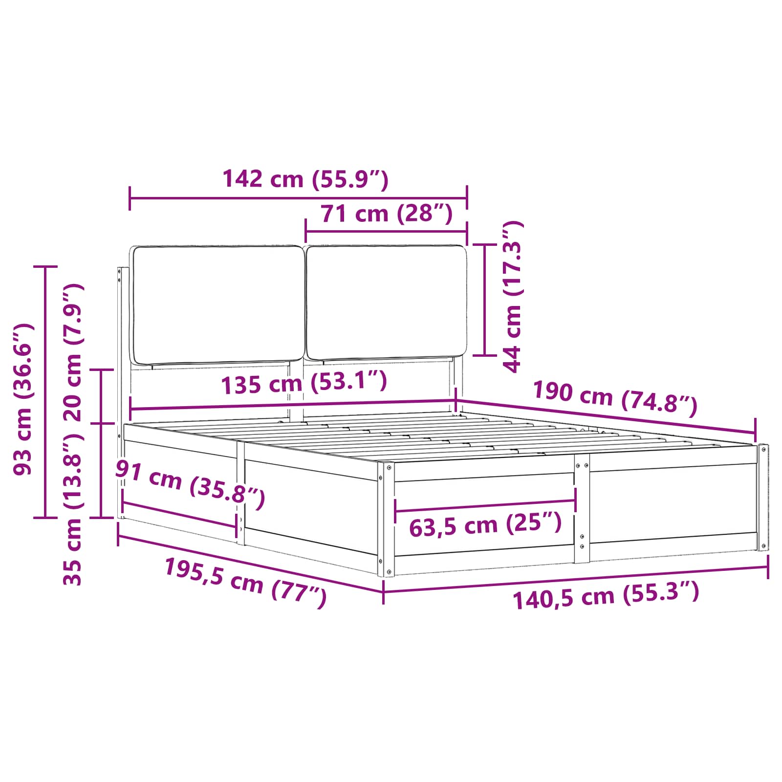 - Matratzengröße: Britisches Doppelbett (135 cm x 190 cm oder 54" x 75")