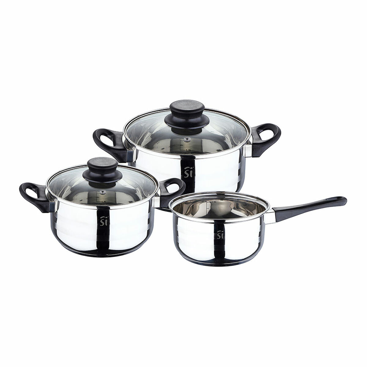 • 5-teiliges Set. Enthält einen Stieltopf & zwei Kochtöpfe mit Deckel
